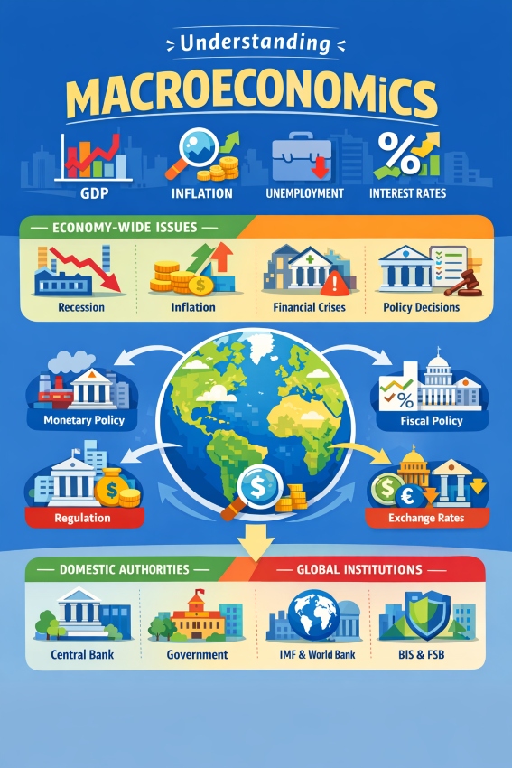 Macroeconomics is the branch of economics that studies the economy as a whole: overall production (GDP), overall price growth (inflation), overall job conditions (unemployment), overall borrowing costs (interest rates), and the ups and downs of activity (business cycles). It asks questions like: Why do recessions happen? Why does inflation rise? What can governments and central banks do about it?