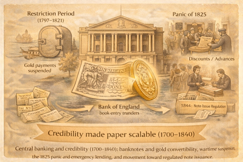 Between 1700 and 1840, “modern money” increasingly meant bank-issued liabilities (notes and deposits) supported—sometimes imperfectly—by convertibility into gold, and stabilized—sometimes reluctantly—by central-bank-like crisis lending. The period’s core tension was credibility: paper money scaled payments, but it also created the risk of runs, over-issuance, and systemic panics. Britain provides the clearest narrative arc: wartime suspension of convertibility (1797–1821), postwar restoration, recurrent crises (notably 1825), and then legislative moves to constrain note issue and improve stability—culminating just after this epoch in the 1844 Bank Charter Act.