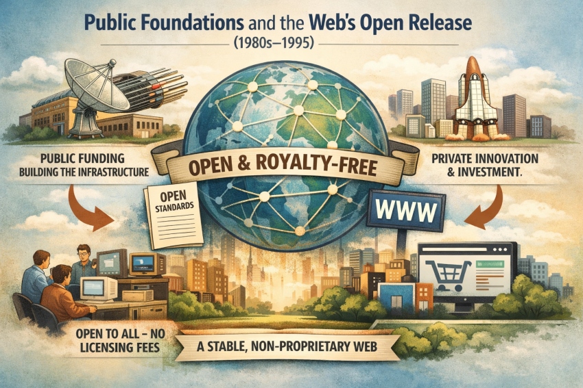The Web did not “win” because it was the only viable technical option. It won because public funding built the underlying infrastructure, and open licensing removed barriers for companies to invest. Once the Web could be implemented without royalties, private actors could confidently build products and services on top of a stable, non-proprietary foundation.