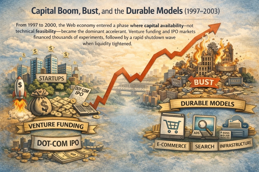 From 1997 to 2000, the Web economy entered a phase where capital availability—not technical feasibility—became the dominant accelerant. Venture funding and IPO markets financed thousands of experiments, followed by a rapid shutdown wave when liquidity tightened.