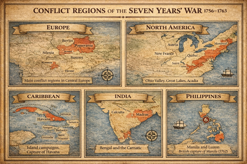 Even “minor” theaters mattered. In West Africa, fighting is often described as limited largely to Saint-Louis (Senegal River) and Gorée, which Britain occupied in 1758–1759. In the Philippines, Britain captured Manila in 1762. These operations were not as large as the continental campaigns, but they mattered because the war’s peace negotiations involved exchanges and restitutions across continents. A war that spreads across oceans ends not as one peace but as a package of bargains.